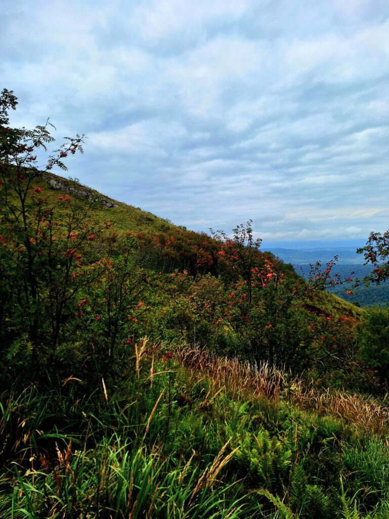 Wchodziliśmy coraz wyżej, aż w pewnym momencie zauważyłam pierwsze jarzębiny. Na początku pojedyncze – jedno drzewko, kilka czerwonych kiści. Z każdym krokiem było ich więcej, aż w końcu weszliśmy w prawdziwy jarzębinowy las – gęstą, pulsującą czerwienią przestrzeń, której kompletnie się tu nie spodziewaliśmy. Jarzębiny otulały ścieżkę z obu stron, ich owoce błyszczały jak koraliki nawleczone na cienkie, ciemne gałązki. W sierpniowym chłodzie ich barwa była jeszcze intensywniejsza – jakby natura próbowała ogrzać to szare przedpołudnie kolorem. Wędrówka przez ten odcinek była jak spacer przez zaczarowany fragment gór – niby zwykła roślinność a jednak przyciągała uwagę swoją nieoczywistością. Czerwień jarzębin była prawdziwym blaskiem tej trasy.