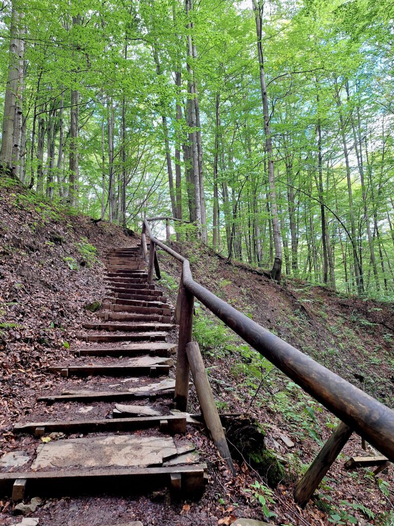 Od pierwszych kroków czuć wilgoć w powietrzu, a ziemia wciąż nosi ślady nocnej mżawki. Trasa prowadzi lekko w górę, a po lewej stronie płynie delikatny potok. Co chwilę otwierają się małe wąwozy, miękkie od zieleni, które wyglądają, jakby chciały nas zatrzymać i zaprosić do odpoczynku. Jesteśmy zachwyceni.