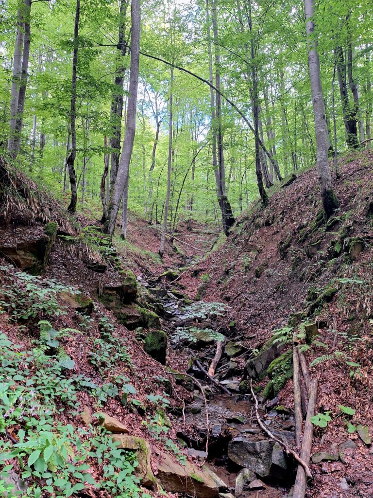 • piękny las z potokiem i wąwozami