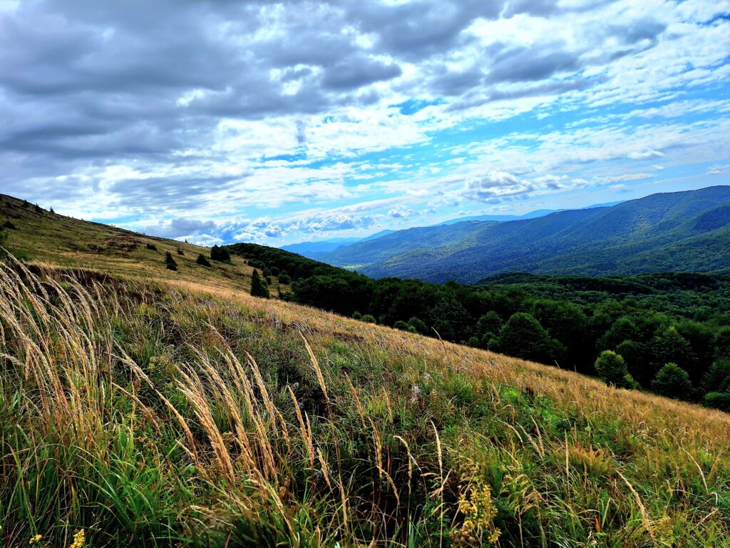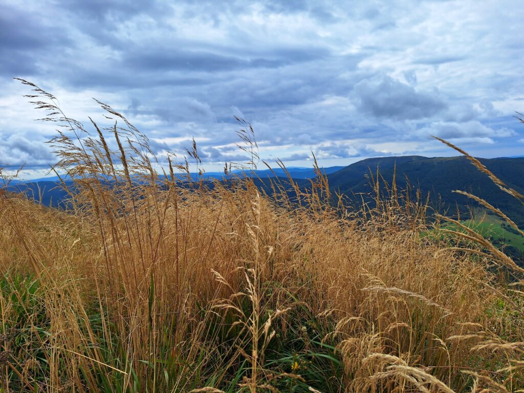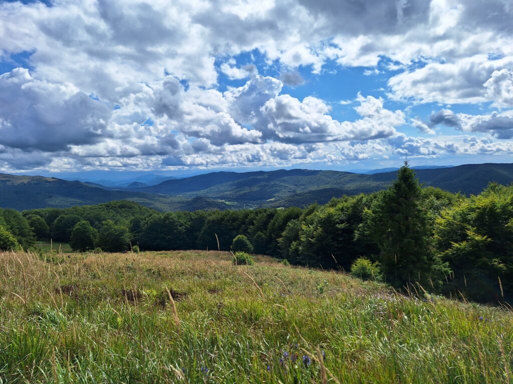Po około półtorej godzinie spokojnego marszu las zaczyna się przerzedzać, a ścieżka wychodzi ponad linię drzew. Rozpościera się przed nami Połonina Caryńska – szeroka, otwarta, surowa w swoim uroku. Morze traw faluje w rytmie wiatru – góra, dół, znowu góra – a każdy zakręt odsłania nowe spojrzenie na krajobraz. Na południowym wschodzie widać potężną Tarnicę, w stronę zachodu ciągnie się Połonina Wetlińska, a pomiędzy nimi zalesione wzgórza i dzikie, zielone przestrzenie. Na grzbiecie szumią trawy skąpane w promieniach słońca, a gdzieniegdzie kwitną niebieskie i różowe kwiaty.