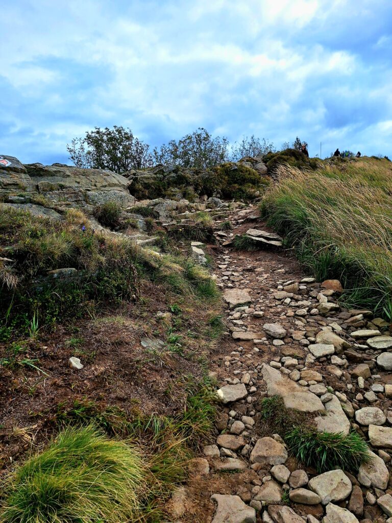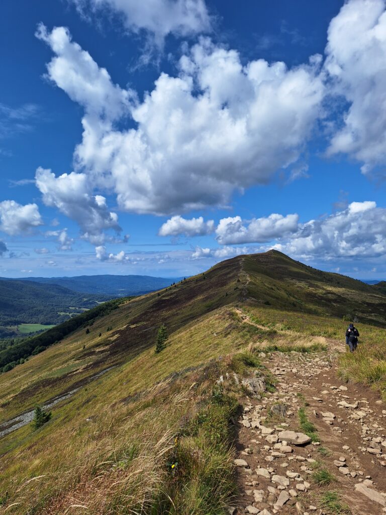 Na Caryńską można wejść z kilku stron – z Ustrzyk Górnych, z Przełęczy Wyżniańskiej albo z Brzegów Górnych. Wybieramy ostatnie podejście – krótsze, ale strome i wymagające. Choć wymaga wysiłku, nagradza to, co czeka wyżej. Po stromym podejściu wychodzimy na grań i dalej wędrujemy w kierunku Ustrzyk Górnych – teraz już łagodnie, z piękną panoramą Tarnicy i Halicza przed sobą. Ten widok towarzyszy nam przez całą drogę, co sprawia, że wędrówka ma w sobie coś wyjątkowego – spokój, przestrzeń i poczucie nagrody za trud włożony w wejście.