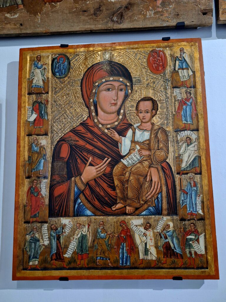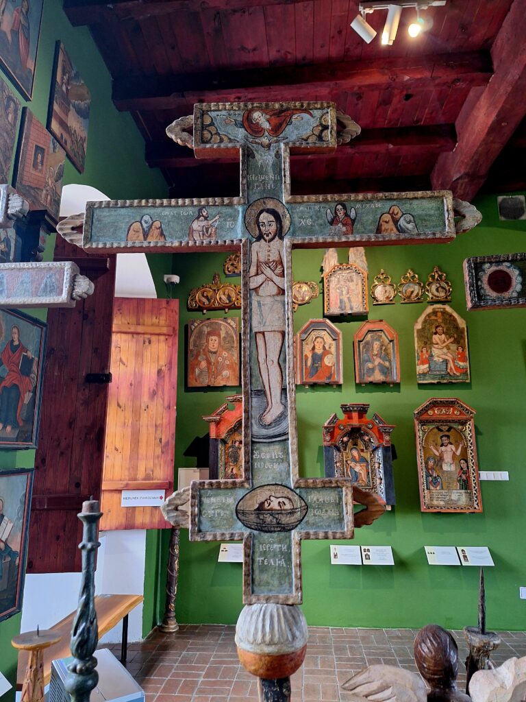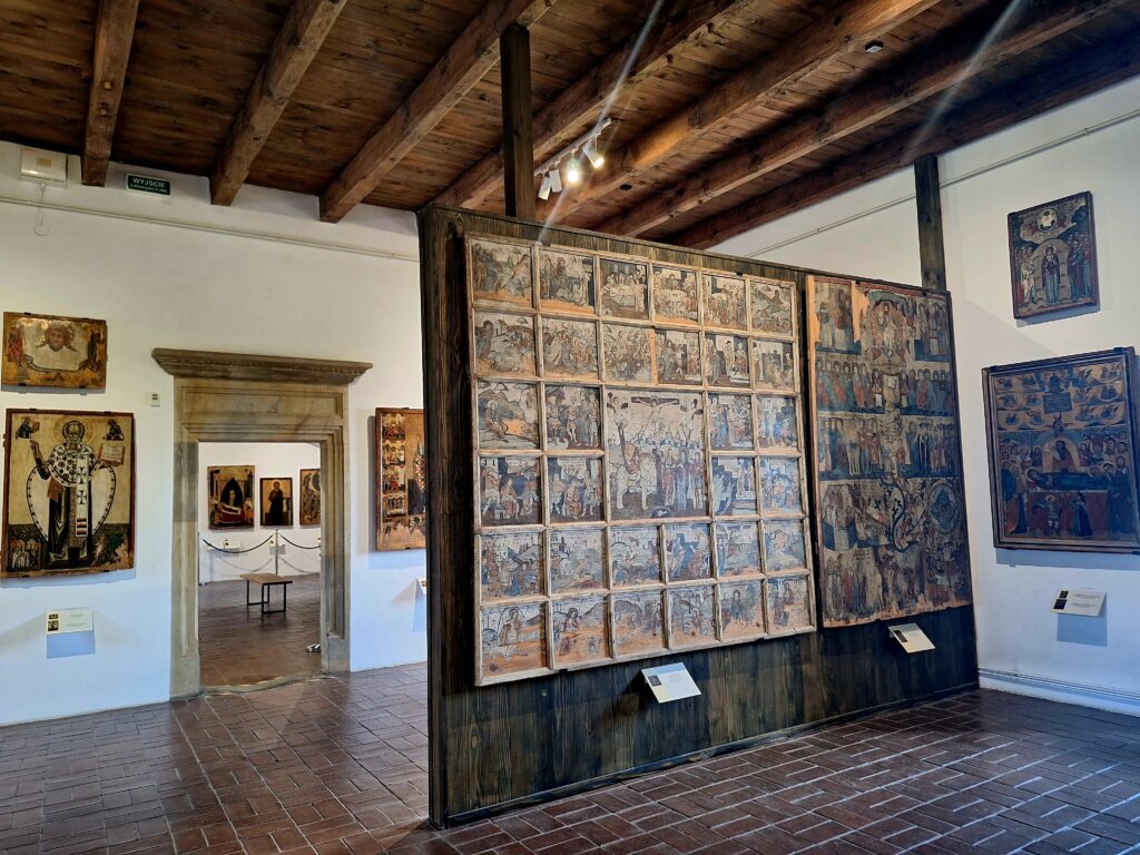 Najbardziej spodobała nam się wystawa sztuki cerkiewnej – naprawdę imponująca, jedna z największych i najpiękniejszych ekspozycji sztuki Kościoła wschodniego w Polsce i Europie. Kolekcja obejmuje ikony oraz przedmioty liturgiczne, w tym krzyże relikwiarzowe i plakietki, pochodzące z XI-XX wieku. Najstarsze ikony, wierne tradycji bizantyjskiej, przedstawiają sceny z życia Chrystusa, Matki Boskiej i świętych, zachwycając precyzją wykonania i duchowym wyrazem. Na wyższych piętrach widać zmiany w stylu ikon od XVI do XVIII wieku – pojawiają się nowe formy, bogatsze zdobienia i bardziej ekspresyjne sceny, które pokazują, jak sztuka wschodnia czerpała wpływy z malarstwa zachodniego. Chronologiczny układ pozwala śledzić rozwój ikon na przestrzeni wieków. Kolory ścian – biel, zieleń i pomarańcz – subtelnie wydobywają detale ikon i dodają przestrzeni ciepła. Zamek, choć z zewnątrz skromny, w środku odsłania prawdziwe bogactwo sztuki i duchowej głębi.