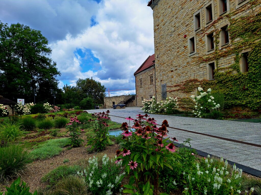 Zbliżając się, odkryliśmy dziedziniec – ławeczki, duże, rozłożyste drzewa i dobrze przemyślaną zieleń. Ta przestrzeń wokół murów, połączona z delikatnymi akcentami zieleni, wzmacnia wrażenie spokoju: surowość zewnętrznych ścian kontrastuje z miękkością otoczenia. To idealne miejsce, by zatrzymać się na moment, usiąść, odetchnąć i spojrzeć na panoramę Sanoka oraz wijącą się w dole rzekę. Kamienna platforma widokowa daje dodatkową perspektywę – stajesz na niej i masz wrażenie, że miasto rozpościera się u Twoich stóp. To miejsce, w którym wspomnienia osiadają na długo, razem z obrazem panoramy miasta i rzeki.